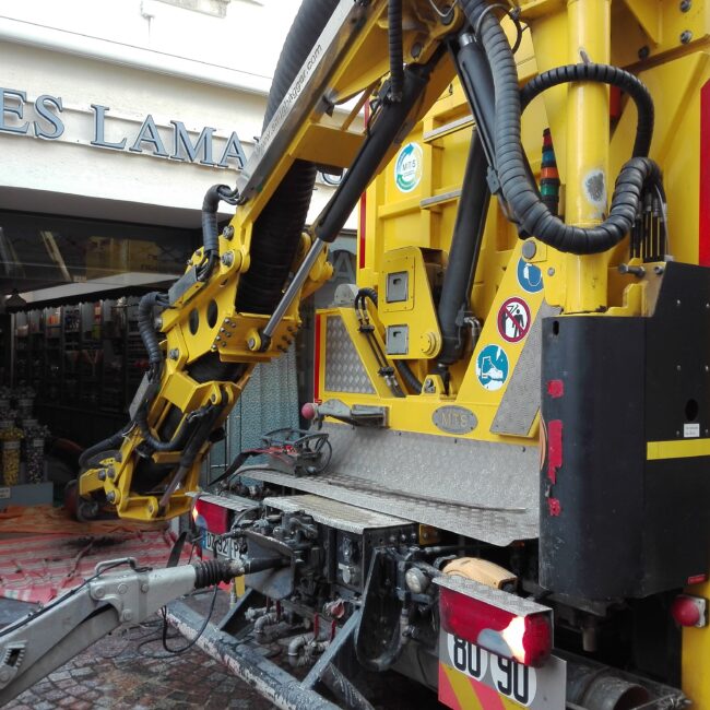 Les chantiers bâtiment présentent souvent des zones inaccessibles aux engins traditionnels. Le camion aspirateur AES, équipé d’un bras articulé, permet d’intervenir facilement sur :