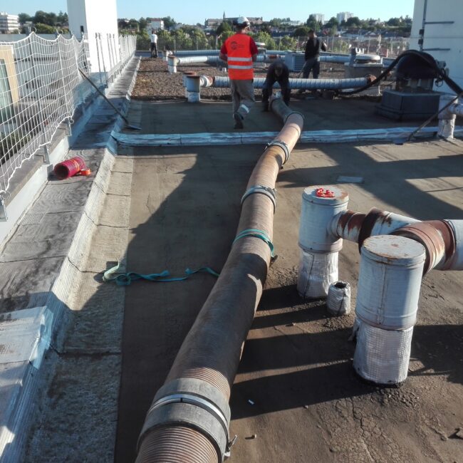 Pour les toitures terrasses, l’aspiratrice excavatrice déploie son bras à la verticale et atteint plusieurs dizaines de mètres de hauteur afin de retirer efficacement les matériaux. Selon le type de machine (deux ou trois turbines), nos tuyaux de rallonge permettent d’aspirer les gravats jusqu’à 150 mètres de distance.